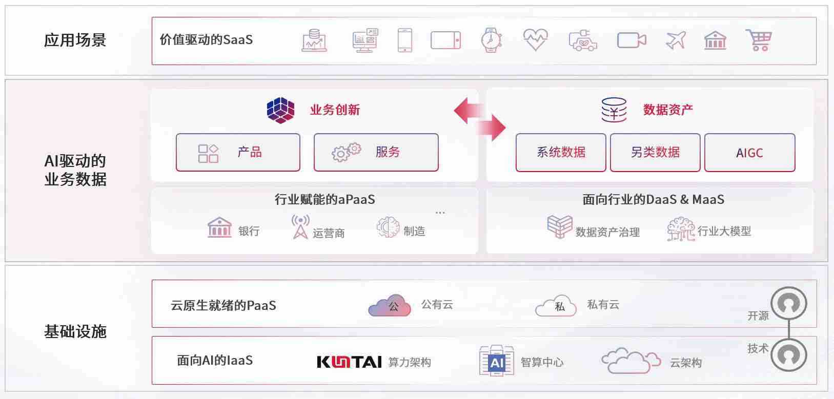 数字时代,,,,围绕企业数字化转型的关键要素,,NG28数码开创性的提出数云融合战略和技术体系框架,,着力在云原生、、数字原生、、、AI原生和信创产业上架构产品和服务能力,,,,为处在不同数字化转型阶段的快消零售、、、、汽车、、金融、、、医疗、、、政企、、教育、、、运营商等行业客户提供泛在的敏捷IT能力和融合的数据驱动能力,,,,构建跨界融合创新的数字业务场景和新业务模式,,,,助力企业级客户建立面向未来的核心能力和竞争优势,,,全面推动社会的数字化、、、智能化转型升级。。。
